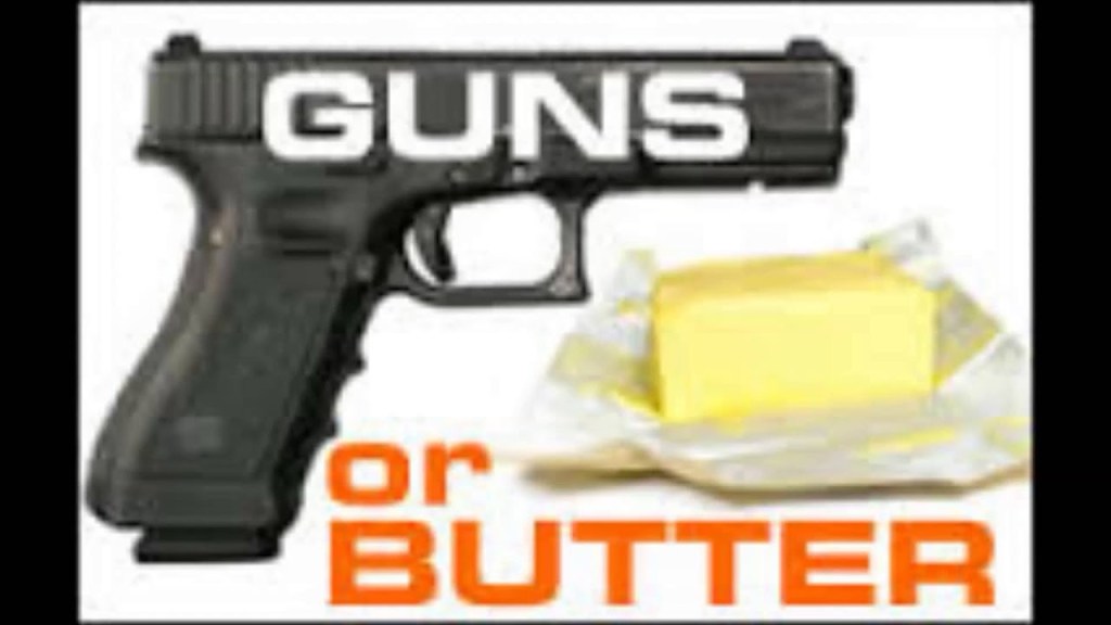 Historically the debate has often been seen as a “Guns or Butter” choice. Perhaps the best known use of the phrase was in Nazi Germany. In a speech on January 17, 1936, Minister of Propaganda Joseph Goebbels stated: “We can do without butter, but, despite all our love of peace, not without arms. One cannot shoot with butter, but with guns.” Referencing the same concept in the summer of the same year another Nazi official, Hermann Göring, announced in a speech: “Guns will make us powerful; butter will only make us fat.”