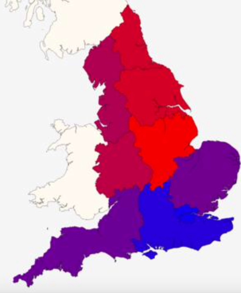 The evidence of a north/south divide cannot be ignored either. In the map below the percentage of children achieving five or more A to C passes in their GCSE exams is shown. The redder the area the fewer the passes, the bluer the more.