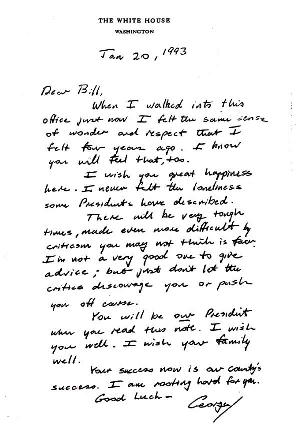 The letter was not released by Clinton until 2016, a couple of years before his predecessor died. That was the year that Donald Trump was elected to be the 45th President of the United States. The two men, Bush and Clinton, Republican and Democrat a generation apart were united by their service and their patriotism. And, without doubt, their aversion to the man who was shortly to move into the office they had honoured.