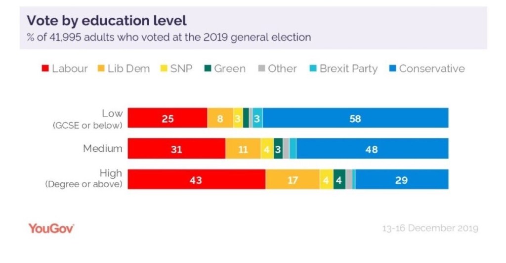 Warning: These are aggregate figures showing general trends. A quarter of “Low” education level voters chose Labour in 2019 and a little more than a quarter of Graduates chose the Conservatives. But the general trend is clear.
