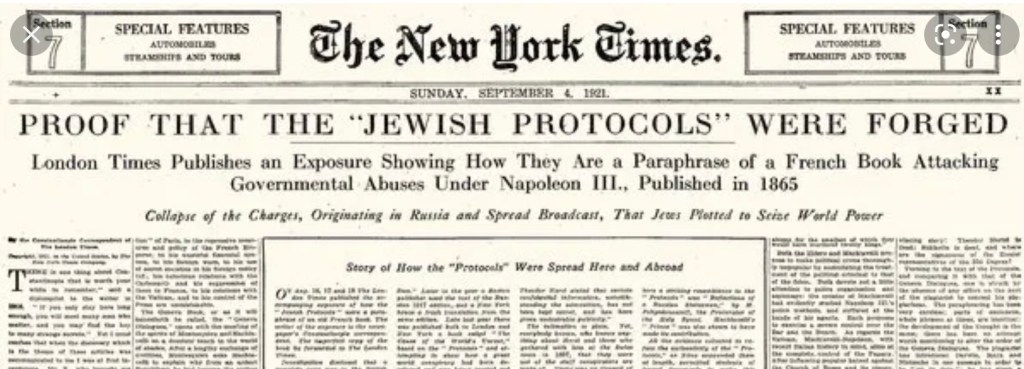 David Aaranovitch in the Times today records how it was a Times journalist, Philip Graves, who, one hundred years ago, bust open “The Jewish Peril” conspiracy and proved it to be fiction,